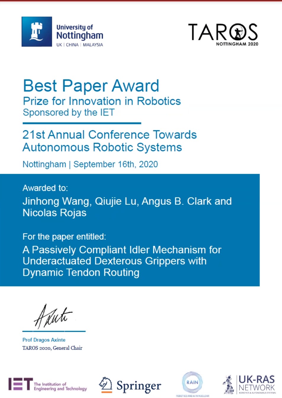 Awarded at Towards Autonomous Robotic Systems Conference (TAROS 2020) for the paper entitled: A Passively Compliant Idler Mechanism for Underactuated Dexterous Grippers with Dynamic Tendon Routing.