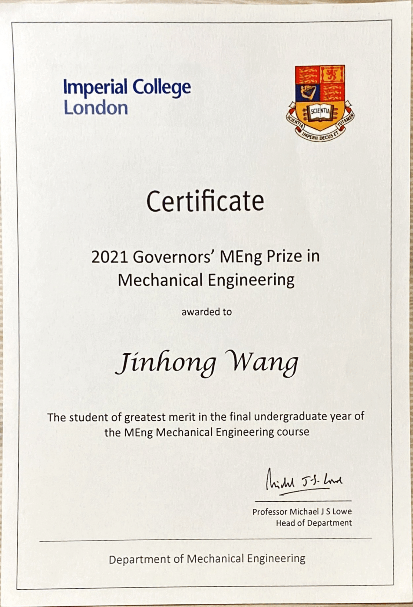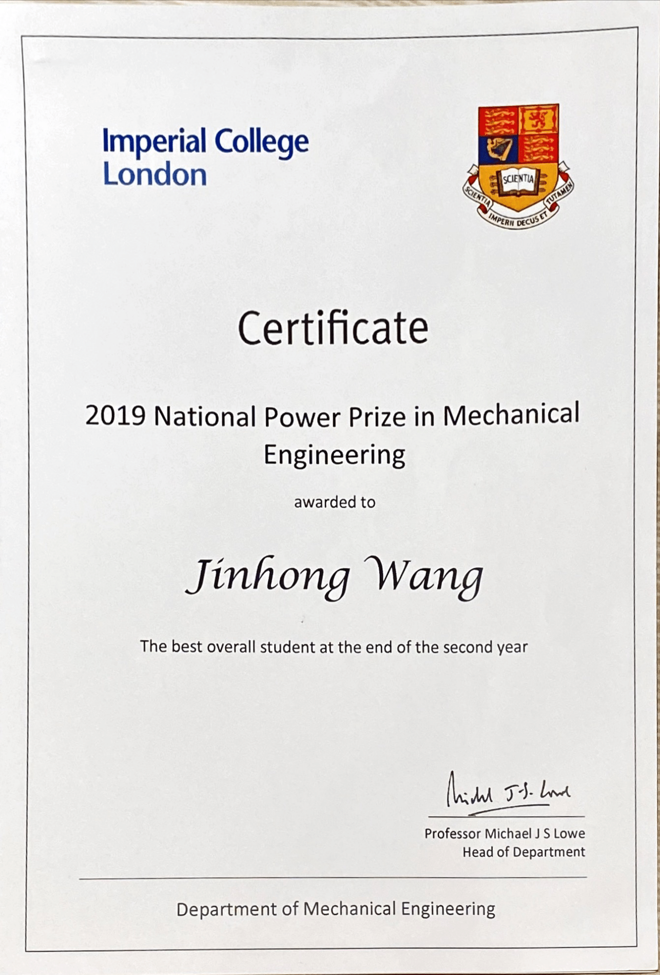 The best overall student at the end of the second year, Department of Mechanical Engineering, Imperial College London.
