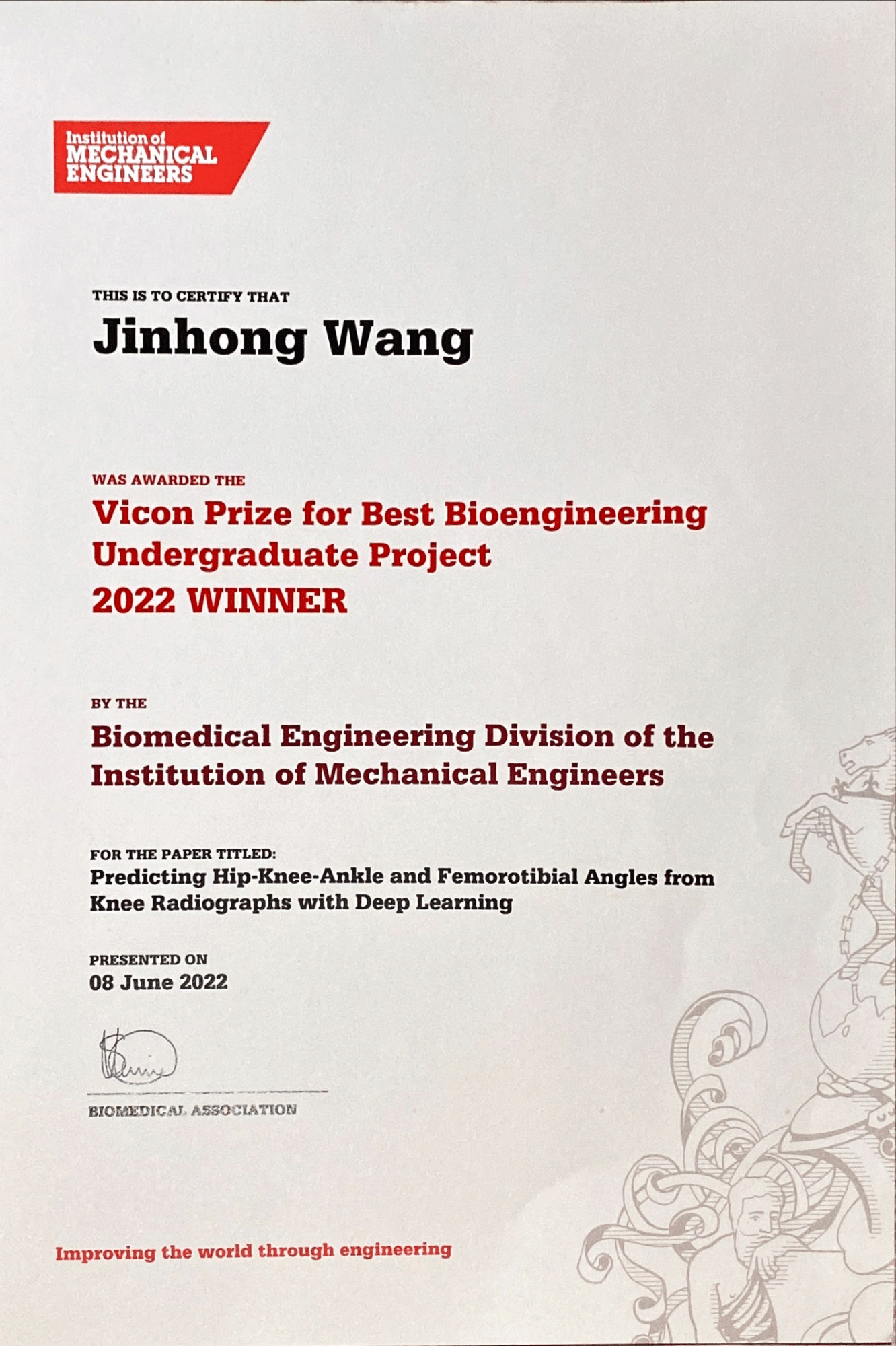 Awarded by Biomedical Engineering Division of the Institution of Mechanical Engineers. Highlighting the best projects in Biomedical Engineering from recent undergraduates and taught Master’s degree graduates. ![]()